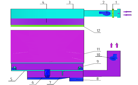 叉車(chē)涂裝生產(chǎn)線(xiàn)水旋噴漆室原理圖 新鮮空氣通過(guò)空調(diào)送風(fēng)裝置送入室體頂部的空氣分配室,經(jīng)均流調(diào)節(jié)和過(guò)濾層后,以一定的端面風(fēng)速均勻送入室體內(nèi),自上而下,將工件置入具有一定風(fēng)速的均流層中,使飛濺的廢漆霧壓入水旋器處理,這樣既改善了工作環(huán)境,又保證了涂層質(zhì)量。