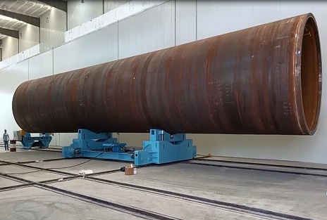 設(shè)備輸送臺(tái)車及工件自動(dòng)轉(zhuǎn)動(dòng)系統(tǒng) 風(fēng)電塔筒輸送平車 1、風(fēng)電塔筒輸送臺(tái)車采用電動(dòng)鉚鏈牽引自動(dòng)行走形式。變頻電機(jī)及滑動(dòng)輪都設(shè)置噴丸室外面的兩端,電機(jī)向前轉(zhuǎn)動(dòng)時(shí),臺(tái)車進(jìn)入噴丸房,后退時(shí),臺(tái)車駛出噴丸房。臺(tái)車分為兩節(jié),中間以一個(gè)電動(dòng)調(diào)節(jié)轉(zhuǎn)動(dòng)輪加以連接,通過轉(zhuǎn)動(dòng)輪的轉(zhuǎn)動(dòng)