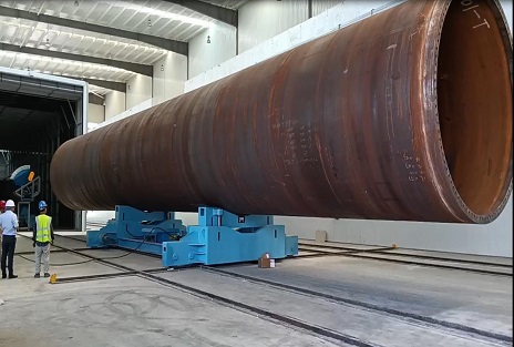 風(fēng)電塔筒拋丸機(jī)設(shè)備用途:該拋丸機(jī)設(shè)備主要是針對(duì)目前國(guó)內(nèi)外風(fēng)力發(fā)電設(shè)備中的風(fēng)電塔筒內(nèi)外表面拋丸處理專門設(shè)計(jì)的。用于自動(dòng)拋丸清理風(fēng)電塔筒內(nèi)外表面的銹蝕、焊渣、氧化皮、油污等一切污物,使其露出均勻一致的金屬本色,保證表面的清潔度,提結(jié)構(gòu)件與涂料的結(jié)合力