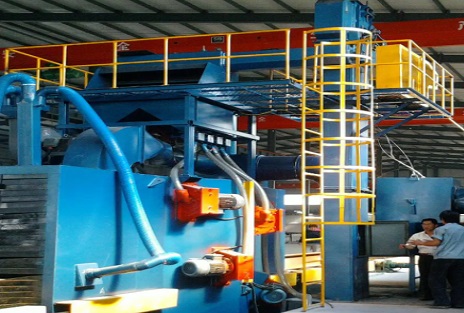 吊鉤通過(guò)式拋丸機(jī)主要用于混凝土攪拌車結(jié)構(gòu)件表面的拋噴丸清理。利用拋丸器高速旋轉(zhuǎn)的葉輪將鋼絲切丸(彈丸)加速拋打至工件表面,對(duì)工件表面進(jìn)行沖擊、刮削,不但可以清理掉工件表面的氧化皮、焊渣、銹蝕和污物等,還可以消除工件的表面應(yīng)力,提高工件的抗疲勞強(qiáng)度