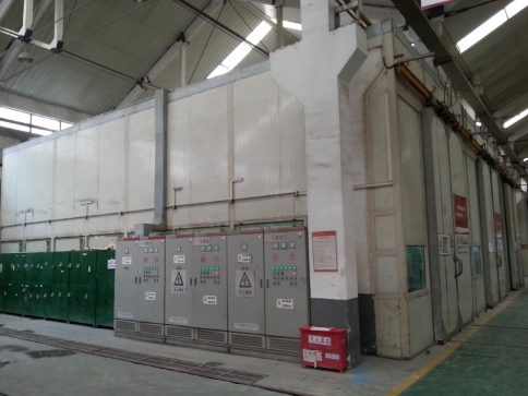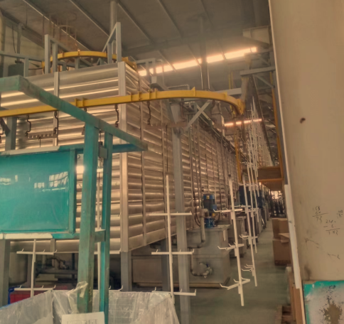 靜電粉體涂裝生產(chǎn)線工藝流程(一) 上件 → 熱水洗 →預(yù)脫脂(60℃) →主脫脂(60℃) →水洗(1) →水洗(2) →酸洗 →水洗(3) →水洗(4) →表調(diào) →磷化(40--45℃,鋁材使用鉻化工藝)→水洗(5) →水洗(6) →純水洗(1) →脫水烘干(120℃) →靜電噴粉系統(tǒng)(含噴粉房、自動(dòng)噴涂升降往復(fù)機(jī)、靜電發(fā)生器、靜電噴槍、粉桶、小旋風(fēng)粉末回收裝置) →烘干固化(160℃-420℃) →冷卻 →下件