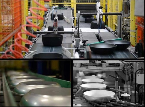 鐵氟龍噴涂生產(chǎn)線?主要針對(duì)廚具行業(yè)如不粘鍋,電飯鍋內(nèi)膽,刀具,烤盤等等。其主要工藝流程:噴砂前處理 → 吹塵 → 噴底油 → 固化 → 噴面漆 → 燒結(jié) → 冷卻 → 下件。