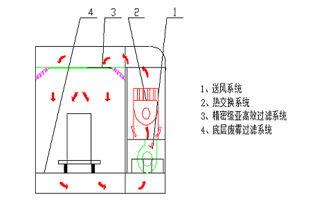 車體噴烘漆房設(shè)備組成及結(jié)構(gòu)特點(diǎn): 本設(shè)備應(yīng)具有噴漆和烘漆兩種功能,噴漆時(shí)需具有通風(fēng)、空氣凈化、漆霧處理及冬季送熱風(fēng)功能;烘干時(shí)需具有升溫、恒溫定時(shí)、廢氣處理功能。且嚴(yán)格按照國家有關(guān)勞動(dòng)安全、衛(wèi)生、消防及環(huán)保等方面的標(biāo)準(zhǔn)進(jìn)行設(shè)計(jì)。