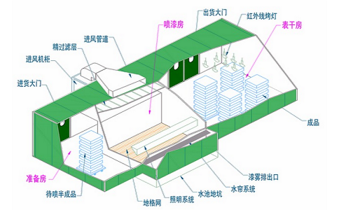 烤漆房一般是用來(lái)噴涂和烘烤車(chē)漆的,因此,烤漆房最確切的描述應(yīng)為“噴烤漆房”。在噴漆時(shí),外部空氣經(jīng)過(guò)初級(jí)過(guò)濾網(wǎng)過(guò)濾后由風(fēng)機(jī)送到房頂,再經(jīng)過(guò)頂部過(guò)濾網(wǎng)二次過(guò)濾凈化后進(jìn)入房?jī)?nèi)。