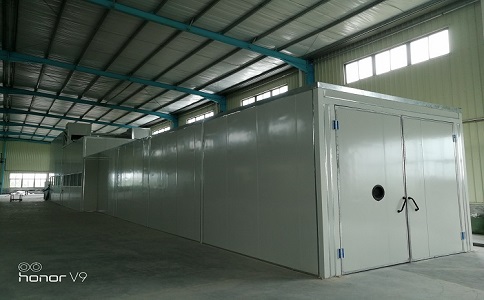 烘干室采用熱風(fēng)循環(huán)燃?xì)忾g接加熱的方式進(jìn)行。通過循環(huán)風(fēng)機(jī)及管道,加熱后的空氣進(jìn)入烘干室內(nèi)與工件進(jìn)行熱交換,實(shí)現(xiàn)對工件的升溫加熱,換熱后的空氣由回風(fēng)管收集,與補(bǔ)充的新鮮空氣一起返回到加熱室,形成內(nèi)循環(huán)。經(jīng)過重復(fù)的循環(huán),從而使工件表面溫度升至規(guī)定溫度。當(dāng)溫度達(dá)到設(shè)定值時,加熱器自動停止工作