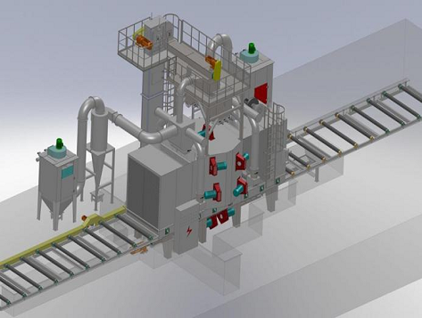 輥道通過式拋丸機主要由拋丸清理室、清掃室、前后密封室、拋丸器總成、室體輥道、前后輸送輥道、滾掃及吹掃系統(tǒng)、氣動供丸系統(tǒng)、分離器、提升機、螺旋輸送器、平臺梯子、除塵系統(tǒng)、電器控制系統(tǒng)、氣控系統(tǒng)等