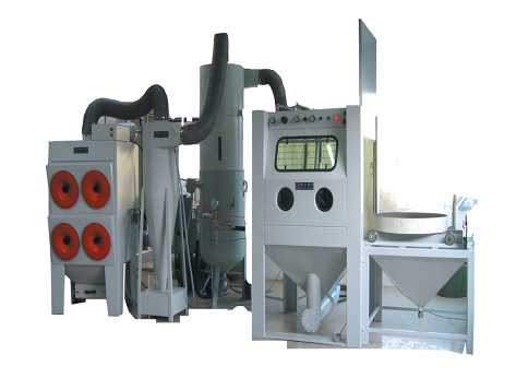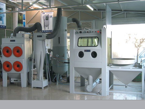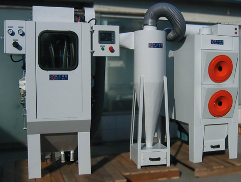 全自動(dòng)干式噴砂機(jī)噴砂作業(yè)是用噴槍和照明在噴砂工作箱內(nèi)操作,磨料大部采用氣力形式回收,空氣凈化裝置有除塵袋、布袋除塵器和濾筒除塵器等形式,工件在噴砂箱清理時(shí),通風(fēng)除塵系統(tǒng)的風(fēng)機(jī)使整個(gè)系統(tǒng)處于負(fù)壓狀態(tài),外界空氣經(jīng)噴砂箱上的進(jìn)風(fēng)口進(jìn)入噴砂箱,將粉塵、細(xì)小的磨料,可再次使用的磨料以及噴砂清理產(chǎn)生的雜質(zhì)一起吸入磨料回收/分離器,磨料及雜質(zhì)首先在磨料回收/分離器內(nèi)與粉塵,細(xì)小磨料分離,可再使用的磨料經(jīng)濾網(wǎng)進(jìn)入儲(chǔ)料斗儲(chǔ)存?zhèn)溆?。而空氣則帶著粉塵和細(xì)小的磨料進(jìn)入除塵裝置凈化后排入大氣。