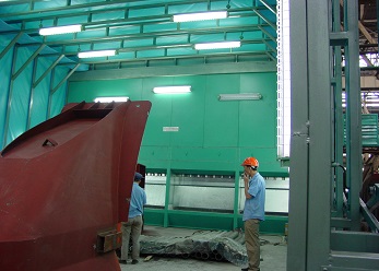 此噴涂線中工件輸送一般采用電動軌道車或天車為輸送方式。該噴涂線主要用于金屬工件、并且材質(zhì)較厚、工件較大的設(shè)備、鋼板,如鑄鍛件、鋼結(jié)構(gòu)件等。1噴1烘一般適合表面要求較低的設(shè)備(一般不建議采用),一般情況下,由于工件較大、重,生產(chǎn)量不高的情況下,噴砂(丸)、除塵都在噴砂房內(nèi)處理。噴底漆、面漆、烘干都在噴烘一體房內(nèi)進(jìn)行。